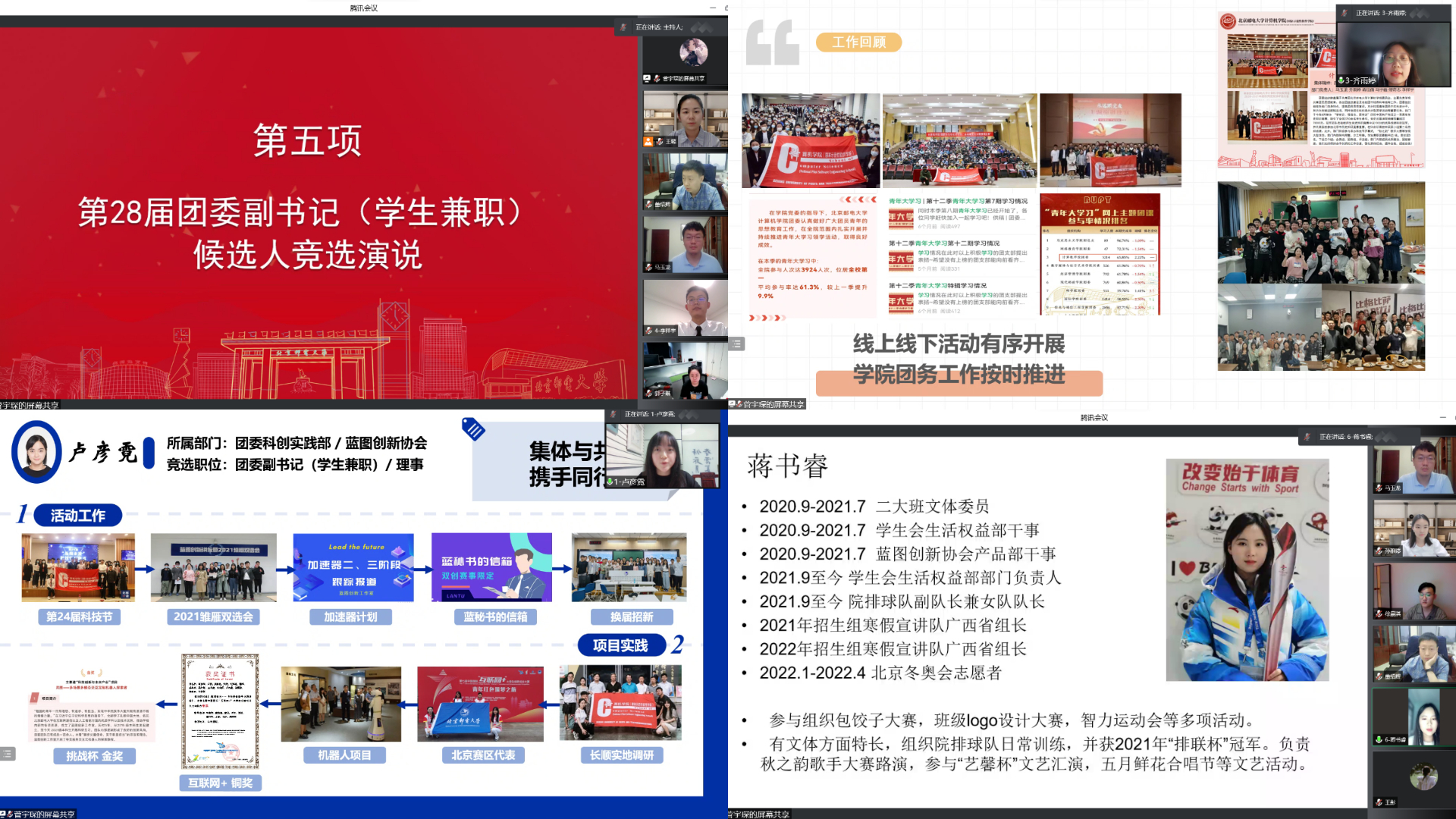 总结环节结束后,必赢官网团委书记王璐老师宣读2021-2022年度优秀团干部名单。王璐老师对大家提出希望,号召青年一代应当不负韶华、不负时代、不负人民,在建功新时代的奋斗中贡献青春力量。随后,第28届学生兼职团委副书记候选人、所属学生组织主要负责人候选人共15位同学依次发表竞选演讲,表达了对团学工作极大的热情与信心。