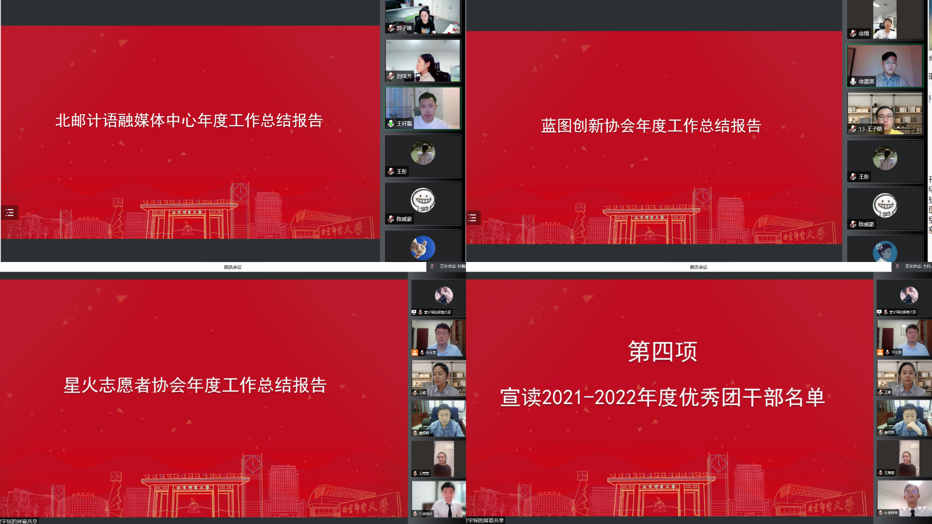 下午六时三十分,大会在全体成员嘹亮的团歌声中拉开帷幕。首先,学生兼职团委副书记、团学联席会议召集人马玉龙同学作第27届团学联席会议工作总结报告。之后,学生兼职团委副书记、北邮计语融媒体中心主任王轩磊同学,学生兼职团委副书记、蓝图创新协会理事会理事长徐晨淇同学和星火志愿者协会主席团成员孙雅婷同学分别对北邮计语融媒体中心、蓝图创新协会和星火志愿者协会过去一年所取得的成绩以及对未来的展望进行了总结与阐述。